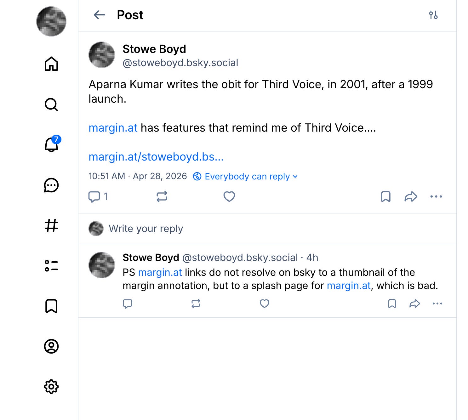 As I comment in the Bluesky reply. ‘PS margin.at links do not resolve on bsky to a thumbnail of the margin annotation, but to a splash page for margin.at, which is bad.’ I deleted the thumbnail but what I’d like is a better rendering, including the original annotation’ like a can get with, say, a substack link.