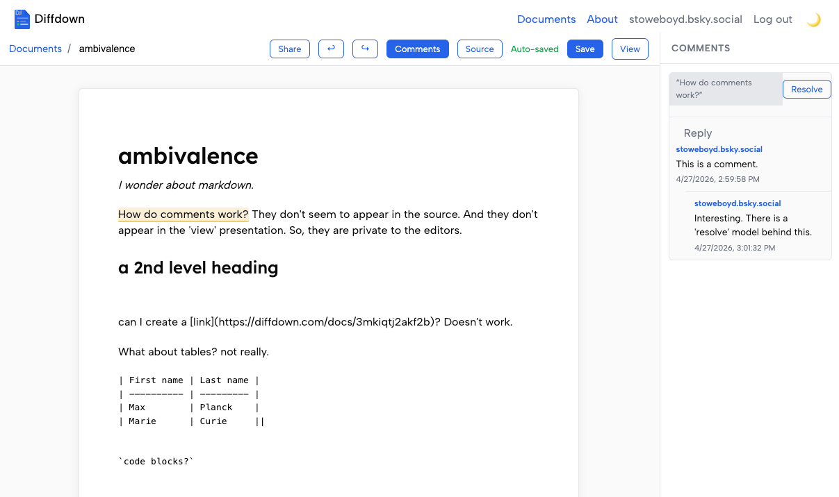 Likewise, AT is built around multiplayer sharing publicly on the web, so I could imagine an Obsidian collaboration layer based on AT, but I don’t know enough to do more than scratch my head about that right now. But the model in Diffdown is promising.