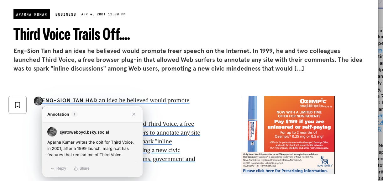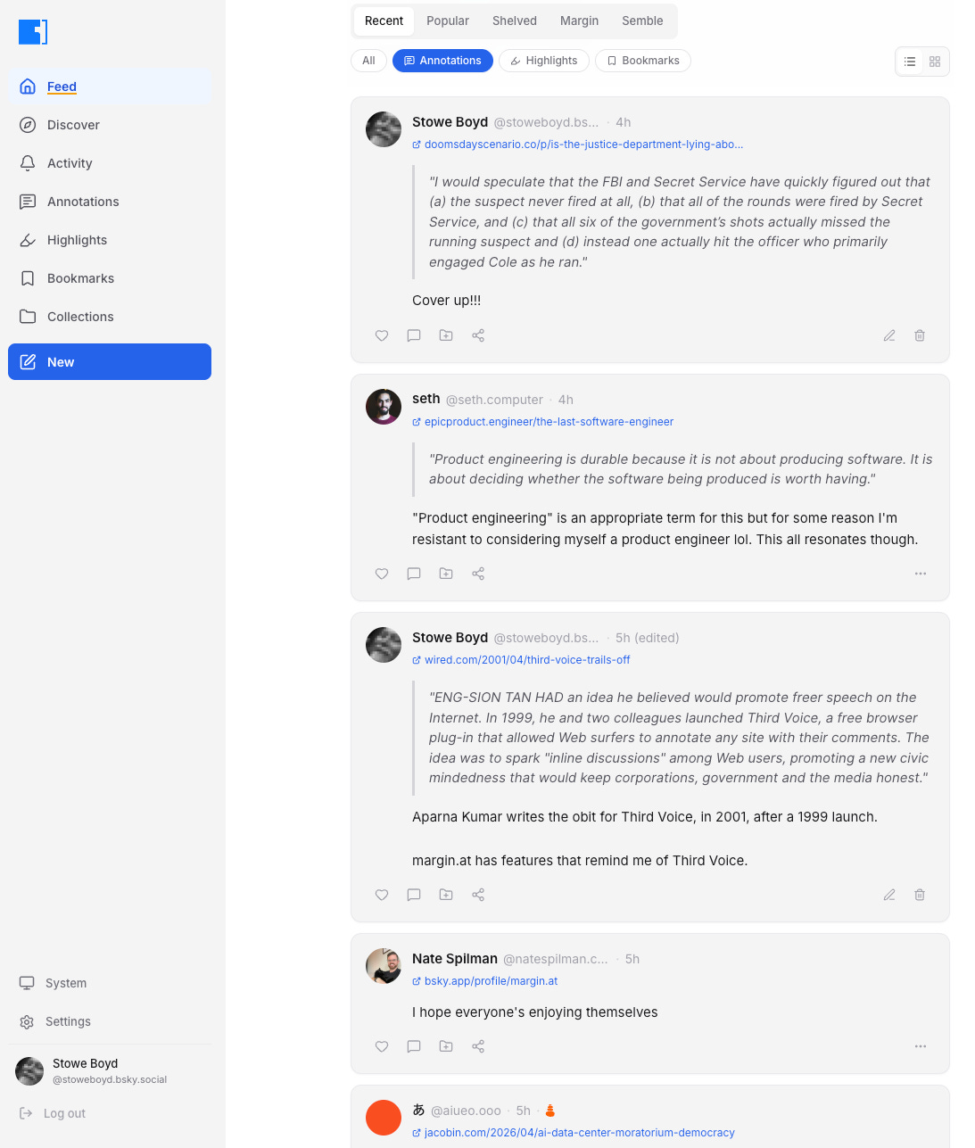 margin.at is multiuser stream of web annotations. Here’s the stream including a few annotations I added.