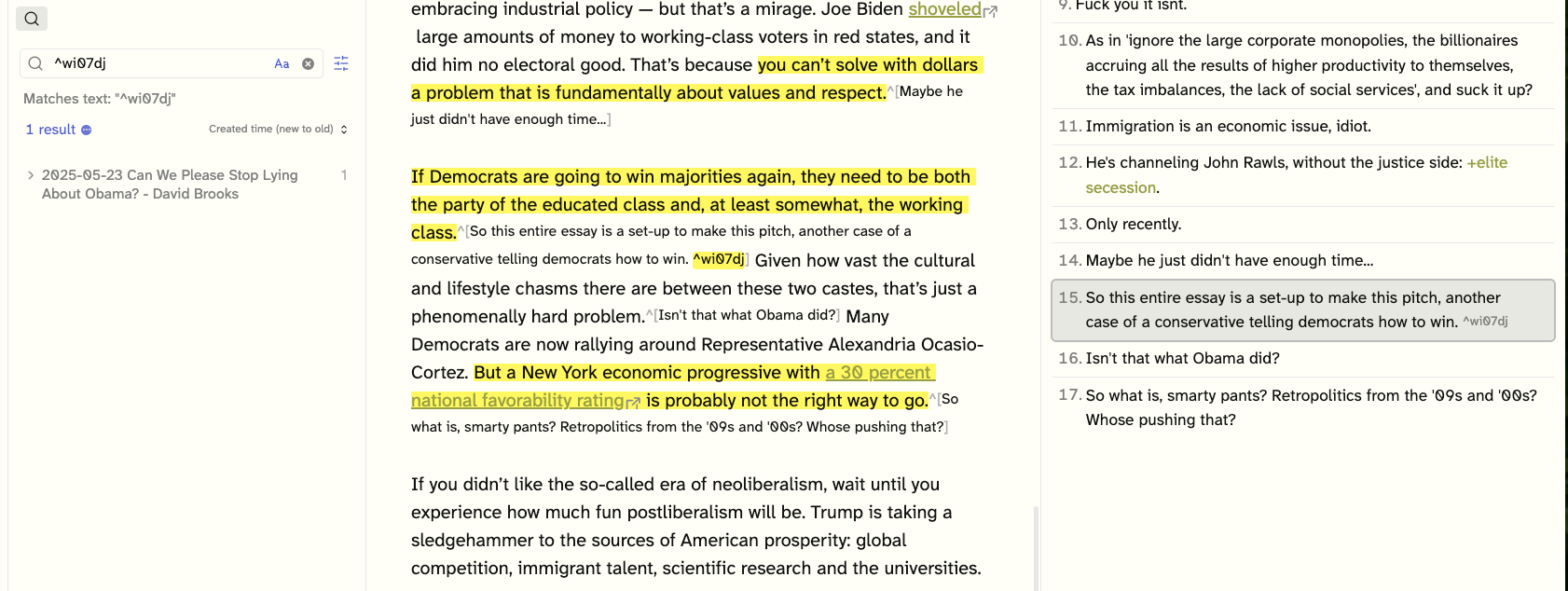 I am a huge user of footnotes, mostly in the form of side notes (see Wonkish: Obsidian Footnotes As Sidenotes and Obsidian Tufte-style Sidenotes), so I really appreciate being able to see all footnotes in a side panel. Here's a large note with many footnotes: