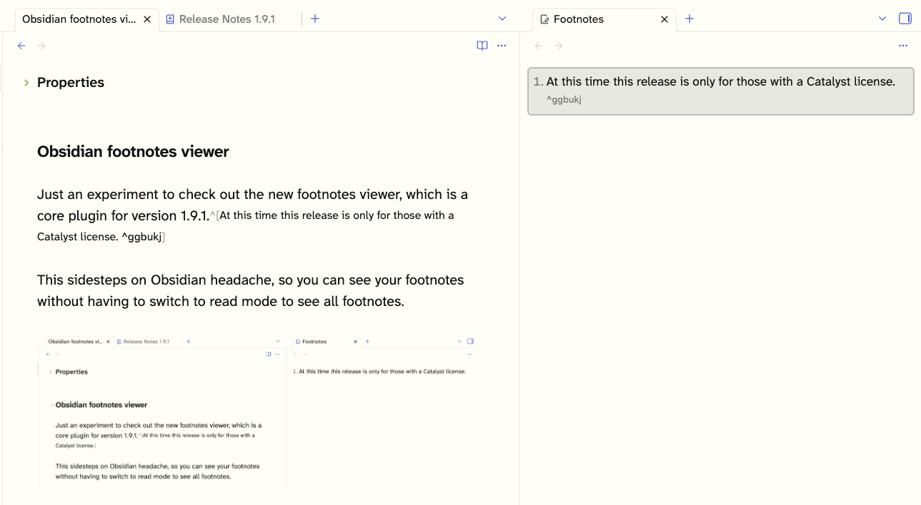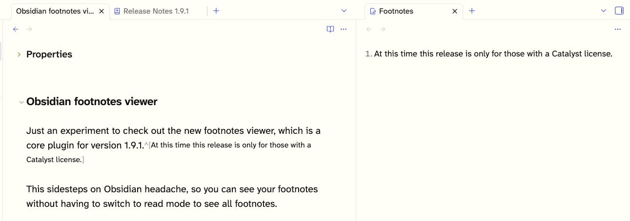 But while fooling around with the viewer, I found a glaring omission: I should be able to click on a footnote in the viewer and have the edit window jump to the clicked footnote. That's coming, I bet; because, of course, it should. [Update 2025-07-03: Obsidian now supports this in the Viewer, although it hasn’t been added to Obsidian’s release notes, which is a curious omission.]