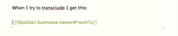 I can also control-click to 'Copy block embed' which leads to a properly formed embed, that however doesn't transclude the footnote reference. That's strange, since the viewer is basically a transclusion of a list of footnotes. Maybe below the hood, Obsidian is using this newly expanded model of block ids to build the viewer?