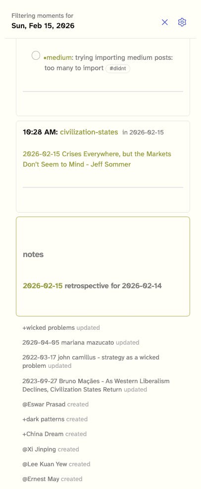 The top entries in boxes are explicit moment I created in the associated Daily Note, about which I will describe next. The bottom entries, like wicked problems updated, are creations and updatings on 2026-02-15 of other files in my vault.