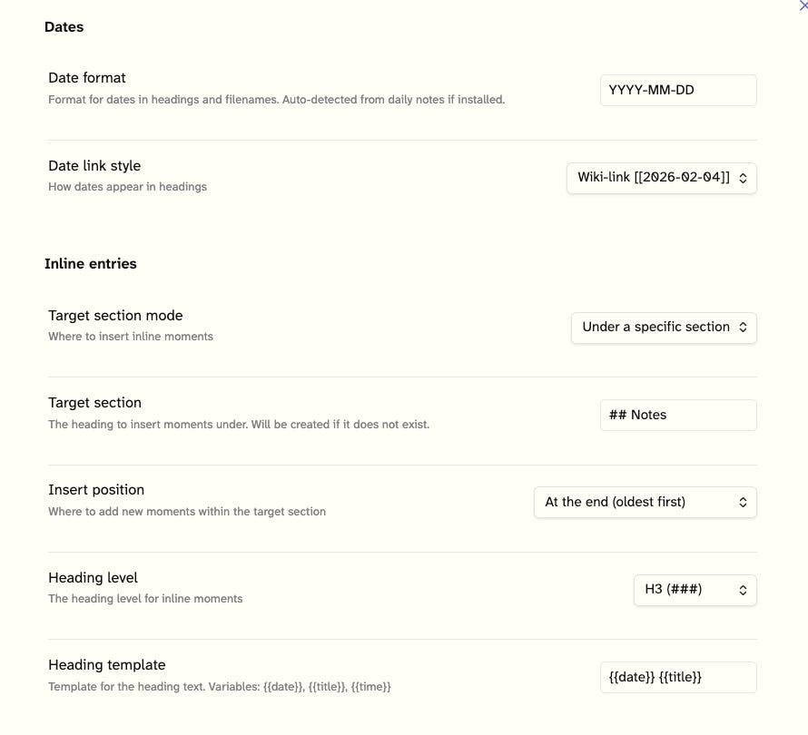 I selected ## Notes as the target section, again, because I already had that section in my Daily Note template. I want to follow my existing journaling style, and append new material at the end (as I set up for the official Obsidian Web Clipper). New ‘moments’ will be H3 headings, with {{date}} {{title}} heading content.