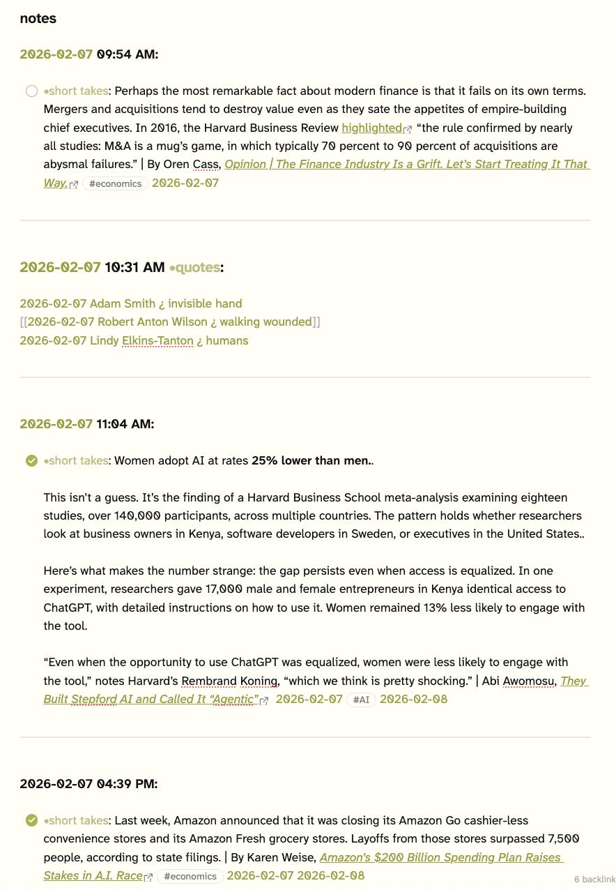 For example, I employ Daily and Weekly notes — a part of the Periodic Notes system — as the backbone of my approach to interstitial journaling. In a nutshell, I have been creating sections in Daily notes for various things I do during each day: I add headings (marked with a project name and a time stamp), tasks, discussions, and links to other notes. Below is a screenshot of part of a Daily note with several journal entries. Many of these are •short takes tasks (for my Short Takes series on workfutures.io) generated by the Obsidian official web clipper, and one is a manually created list of links to quotes I created that day.