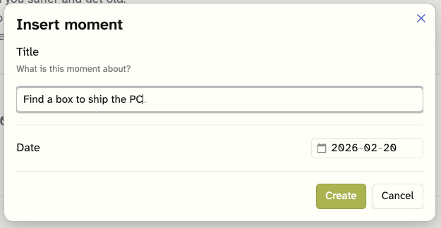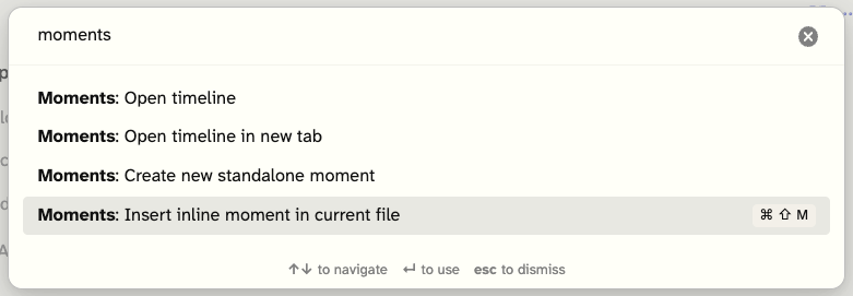 I haven’t explored the other command options yet, except to test Create new standalone moment which creates a new note and inserts a moment in it.