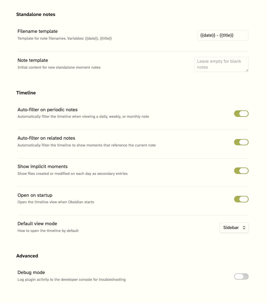 The manually created list of links is a good starting point for why I decided to take a first look at a new plugin, Obsidian Moments (now in beta). Here’s how the developer behind it — Matt McManus — describes it [emphasis mine]: